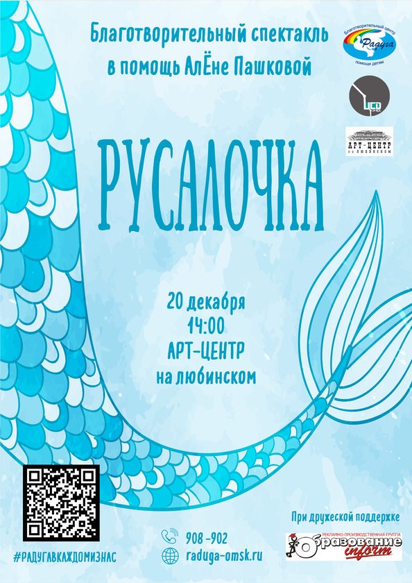 Благотворительный центр «Радуга» и Центр Современной Драматугии, Арт-цент на Любинском зовет творить волшебство. В канун Нового года, как сообщает корреспондент ИА МАНГАЗЕЯ, 20 декабря, в Арт-центре на Любинском состоится Благотворительный спектакль «Русалочка».