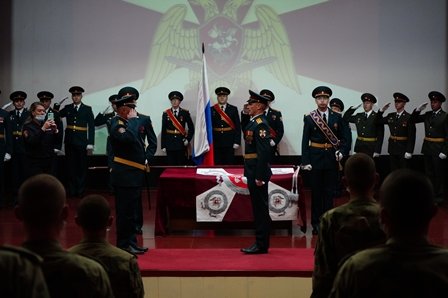 В Центре подготовки личного состава Северо-Западного округа войск национальной гвардии Российской Федерации состоялась торжественная церемония прибивки полотнища Боевого знамени к древку и его освещение настоятелем храма Александра Невского протоиереем Иоаном.