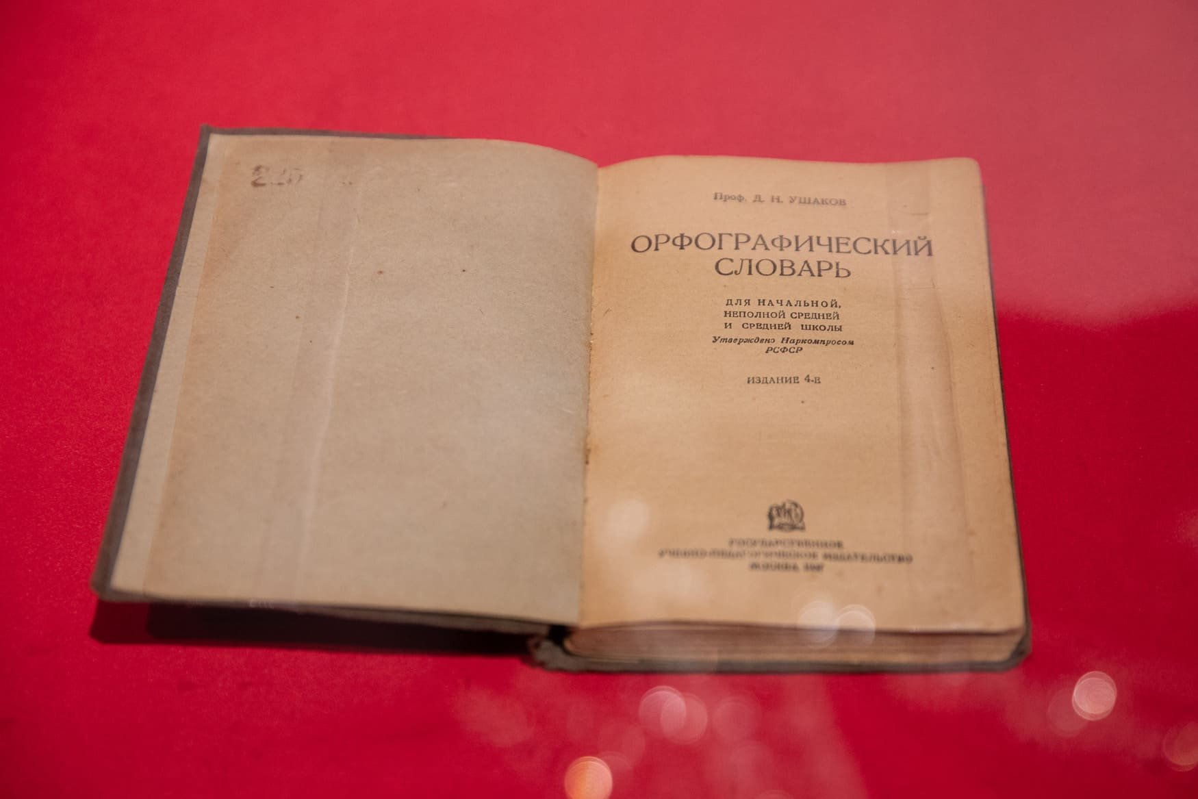 Посетители увидят «Орфографический словарь» для начальной, неполной средней и средней школы, изданный в 1937 году Государственным учебно-педагогическим издательством. Работа по его составлению была начата профессором Александром Пешковским и продолжена известным лингвистом Дмитрием Ушаковым, который довел работу до конца в сотрудничестве с Сергеем Крючковым. Словарь принадлежал Григорию Максимову, который в годы войны, будучи 12-летним мальчишкой, был партизаном и работал почтальоном.