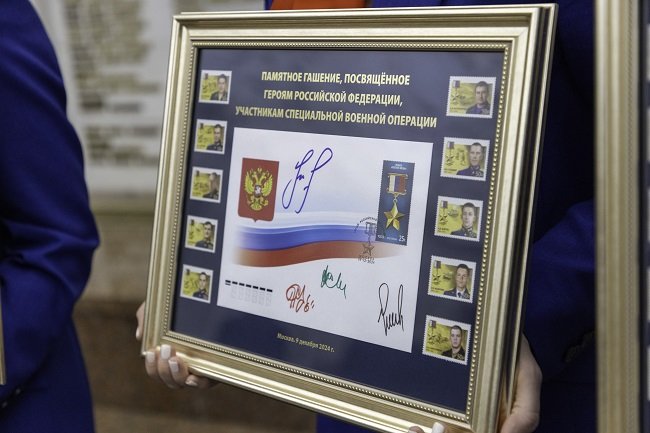 Участники церемонии подписали конверты со специальной художественной почтовой маркой с изображением медали «Золотая Звезда», которая вручается Героям РФ и присваивается Президентом России Владимиром Путиным за заслуги перед государством и народом, связанные с совершением геройского подвига. К церемонии был изготовлен специальный сувенирный штемпель. На штемпеле указана дата 9 декабря 2024 год, дата выхода в почтовое обращение десяти почтовых марок серии «Герои Российской Федерации», посвященных российским военным, проявившим мужество и самоотверженность при исполнении воинского и служебного долга и удостоенным звания Героя Российской Федерации (посмертно).