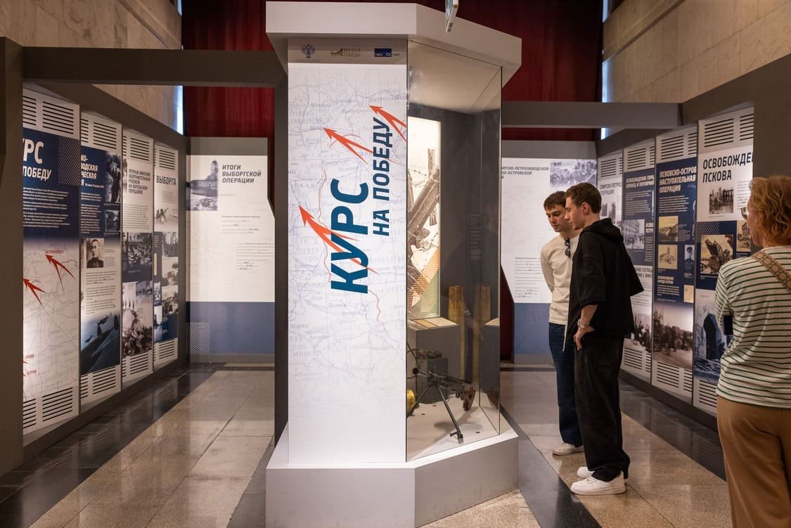 Выставочный проект «Курс на Победу» рассказал об окончательном освобождении РСФСР и Псковско-Островской операции. В экспозицию вошло около 100 подлинных экспонатов из фондов Музея Победы – фотографии, документы, плакаты, рисунки военных художников. Среди предметов – оружие и вооружение, обмундирование и личные вещи бойцов Красной Армии, а также офицеров и солдат финской армии. Кроме того, на выставке представили оцифрованные фотографии, которые проиллюстрировали хронологию боевых действий – освобождение Выборга, форсирование реки Свирь, подписание соглашения о перемирии с Финляндией и др. За время работы выставки – с 31 июля 2024 года – ее посетили почти 190 тысяч человек.