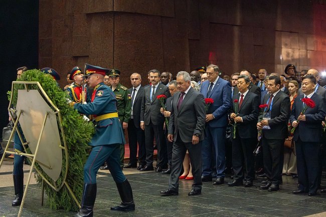 Секретарь Совета безопасности РФ Сергей Шойгу возложил венок к скульптурной группе «Скорбь», олицетворяющей в образе женщины всех матерей, жен, сестер и дочерей, оплакивающих погибших солдат. Затем главы делегаций возложили цветы к подножию скульптуры.