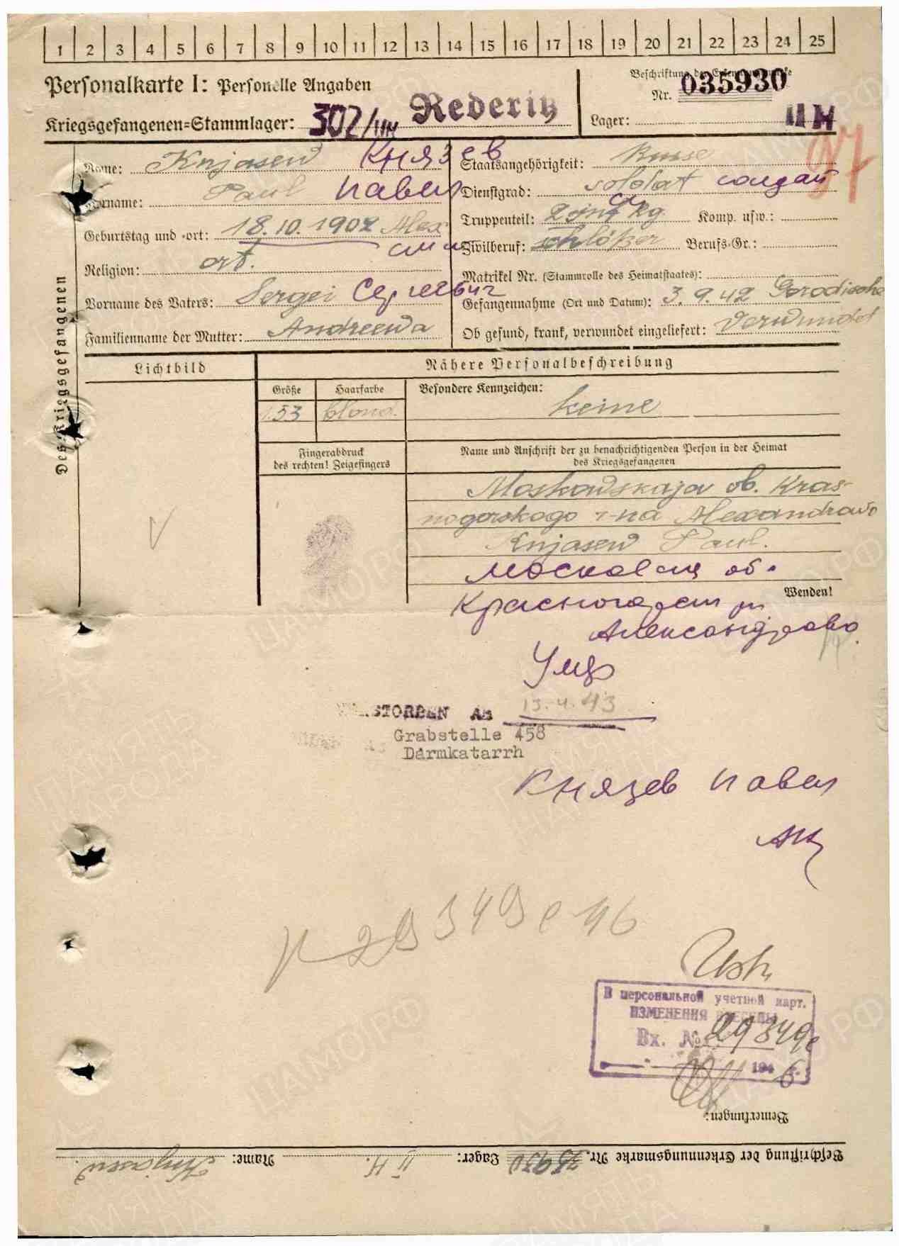 Как сообщили корреспонденту Информационного агентства МАНГАЗЕЯ, «Центр сохранения памяти о советских военнопленных», созданный на базе Красногорского филиала Музея Победы, нашел родственников участника Великой Отечественной войны, уроженца Красногорска (Московская область) Павла Сергеевича Князева. Семья ничего не знала о его судьбе с августа 1942 года.