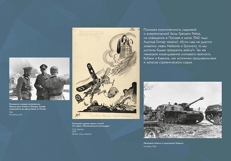 «Выставка рассказывает о Кавказской битве как о масштабном, ожесточённом сражении, развернувшемся в сложнейших условиях степей, приморья и горно-лесистой местностей. Бои велись на земле, на воде и в воздухе. Битва за Кавказ завершилась 9 октября 1943 года. Она стала одной из самых продолжительных в истории Великой Отечественной войны: 442 суток советские войска отважно сражалась за стратегически важный регион, потеря которого грозила утратой драгоценных ресурсов и поражением в войне», — отметили в Музее Победы.