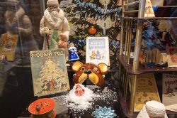 Центральное место заняла витрина, в которой можно увидеть ватные фигуры Дедов Морозов, неизменно любимые у всех детей мягкие игрушки – мишки и другие предметы быта.