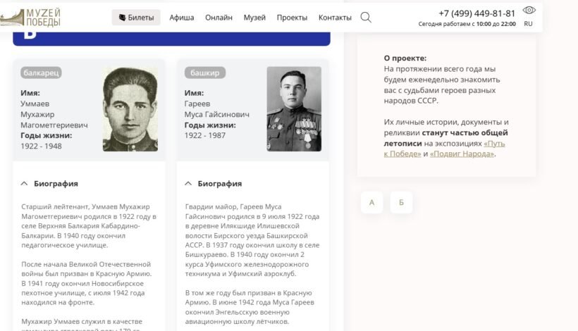 В специальном разделе на сайте культурной площадки появились истории о беспримерном мужестве, отваге и героизме балкарца, башкира и бурята. К примеру, интернет-пользователи могут узнать, как башкир Муса Гареев 1 августа 1943 года вступил в воздушный бой с тремя немецкими истребителями Fw 190 и был подбит. Несмотря на это, летчик смог перелететь линию фронта и посадить самолёт в 800 метрах от передовой.
