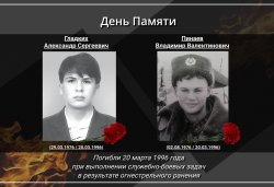 Как сообщили корреспонденту Информационного агентства МАНГАЗЕЯ, сегодня отмечается 27 годовщина со дня гибели военнослужащих внутренних войск – уроженцев Архангельской области сержанта Александра Гладких и рядового Владимира Пинаева, погибших при выполнении воинского долга на территории Северо-Кавказского региона.