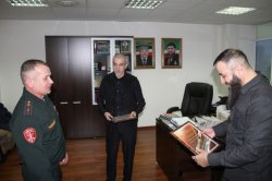Военнослужащие соединения майор Вадим Макаренко, старшина Денис Чумак и ефрейтор Александр Ротатый встретились с главными редакторами газет «Вести республики», «Терская новь», «Иман», «Гумс», «Маршо», «Теркйист», «Зов земли» и «Терская правда».