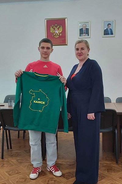 На память о встрече с наставником у Кирилла остался подарок: книга и толстовка с надписью «Канск».