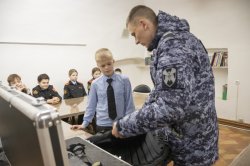 Росгвардеец рассказал ученикам 6 класса кадетской школы им. Евгения Родионова Ростовского района о мерах обеспечения охраны сотрудниками ведомства музея-заповедника от несанкционированных проникновений, а также продемонстрировал элементы экипировки, применяемые в служебной деятельности.