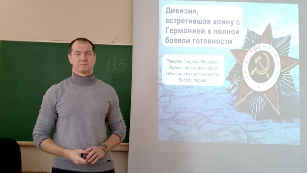 Как сообщили корреспонденту Информационного агентства МАНГАЗЕЯ, в ходе беседы с учащимися 3-го курса Авиационного техникума города Кирова Владимир Эдуардович рассказал о малоизвестном эпизоде истории Великой Отечественной войны, когда грамотные действия командира 41-й стрелковой дивизии генерал-майора Георгия Микушева, который смог 5 дней: с 22 по 26 июня 1941 года удерживать одной дивизией Рава-Русский укрепрайон против 5 немецких пехотных дивизий.