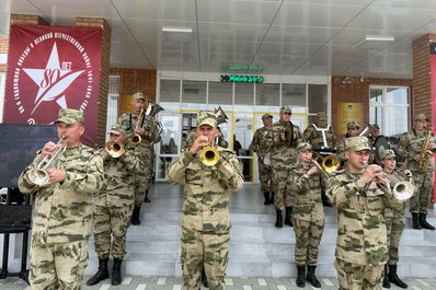 Кроме того, в рамках акции военный оркестр соединения обеспечил музыкальное сопровождение торжественной церемонии открытия специальной площадки в средней общеобразовательной школе №4 столицы региона.