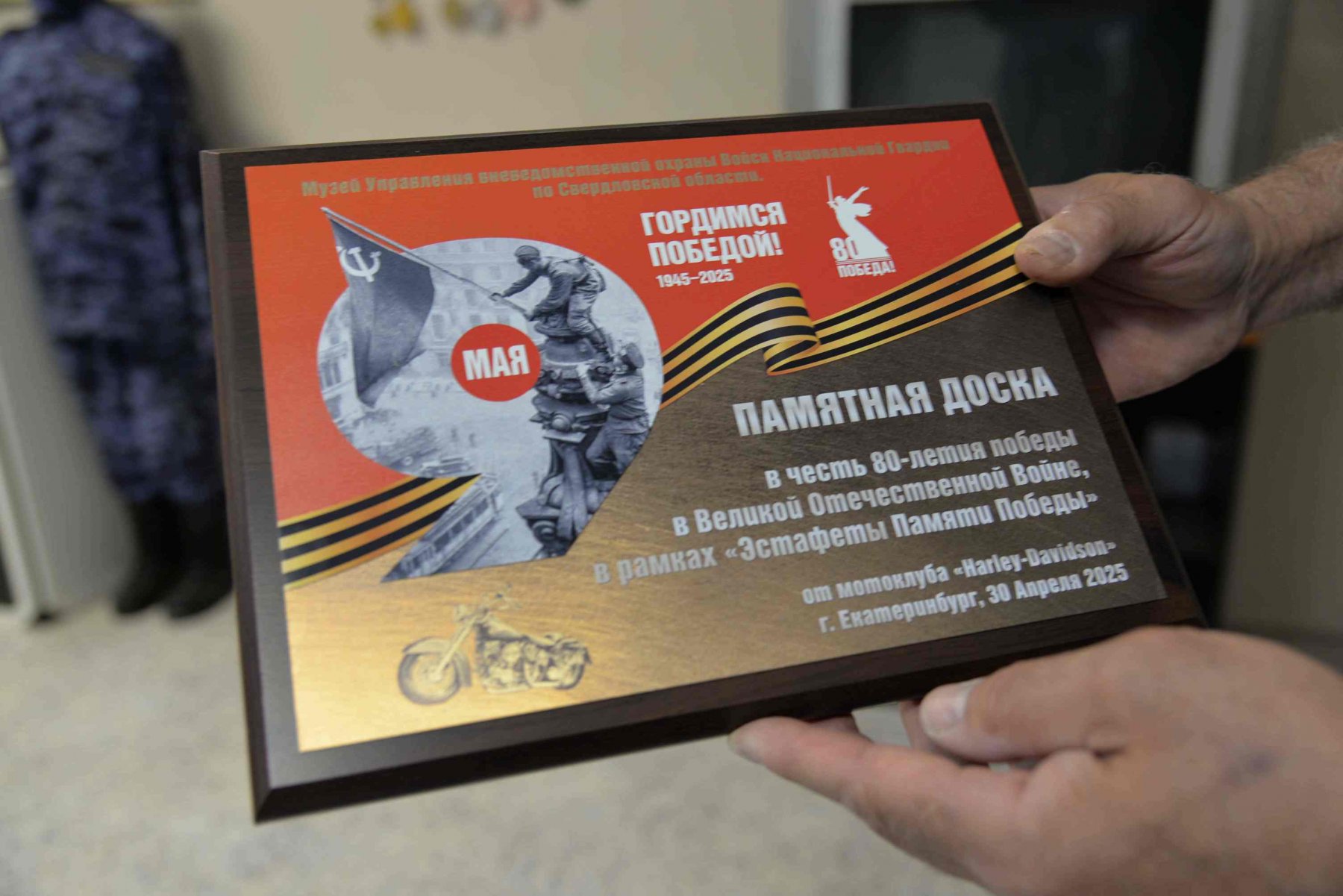 В торжественной обстановке ветераны ведомства вручили представителям клубов Сергею Горнову и Алексею Вишневу благодарственные письма от руководства Уральского округа Росгвардии, территориального управления и областного управления вневедомственной охраны. В свою очередь, почетные гости вручили в дар музею памятную доску и отметили, что и в будущем продолжат взаимодействие с Росгвардией в мероприятиях в честь Великой Победы.
