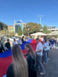 Представители Молодежных советов Главного управления, ГУФСИН России по Ростовской области, ГУФССП России по Ростовской области, ФБУ Южный РЦСЭ Минюста России, УЗАГС Ростовской области, Совета молодых адвокатов Ростовской области, Нотариальной палаты Ростовской области, Территориального органа Федеральной службы по надзору в сфере здравоохранения по Ростовской области, Управления Росреестра по Ростовской области, а также стажер Благотворительного фонда «Белый Ангел» Нина Смирнова на набережной Донской столицы развернули большое полотно российского триколора.