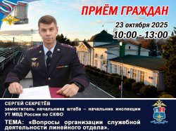 23 октября 2025 года с 10:00 до 13: 00 в административном здании в приемной Нальчикского ЛО МВД России на транспорте (г. Нальчик) по адресу: г. Нальчик, ул. Осетинская, 132А состоится личный прием граждан заместителем начальника штаба – начальник инспекции УТ МВД России по СКФО полковник внутренней службы Сергеем Секретёвым, по вопросам организации служебной деятельности линейного отдела, сообщили корреспонденту Информационного агентства МАНГАЗЕЯ в пресс-службе УТ МВД России по СКФО.