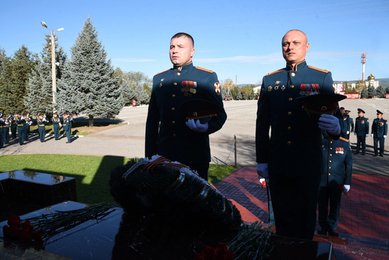 Участники мероприятия почтили память погибших боевых товарищей минутой молчания и возложили венок и цветы к подножию мемориала героям, до конца выполнившим свой воинский долг и сохранившим для новых поколений мирное небо над головой.