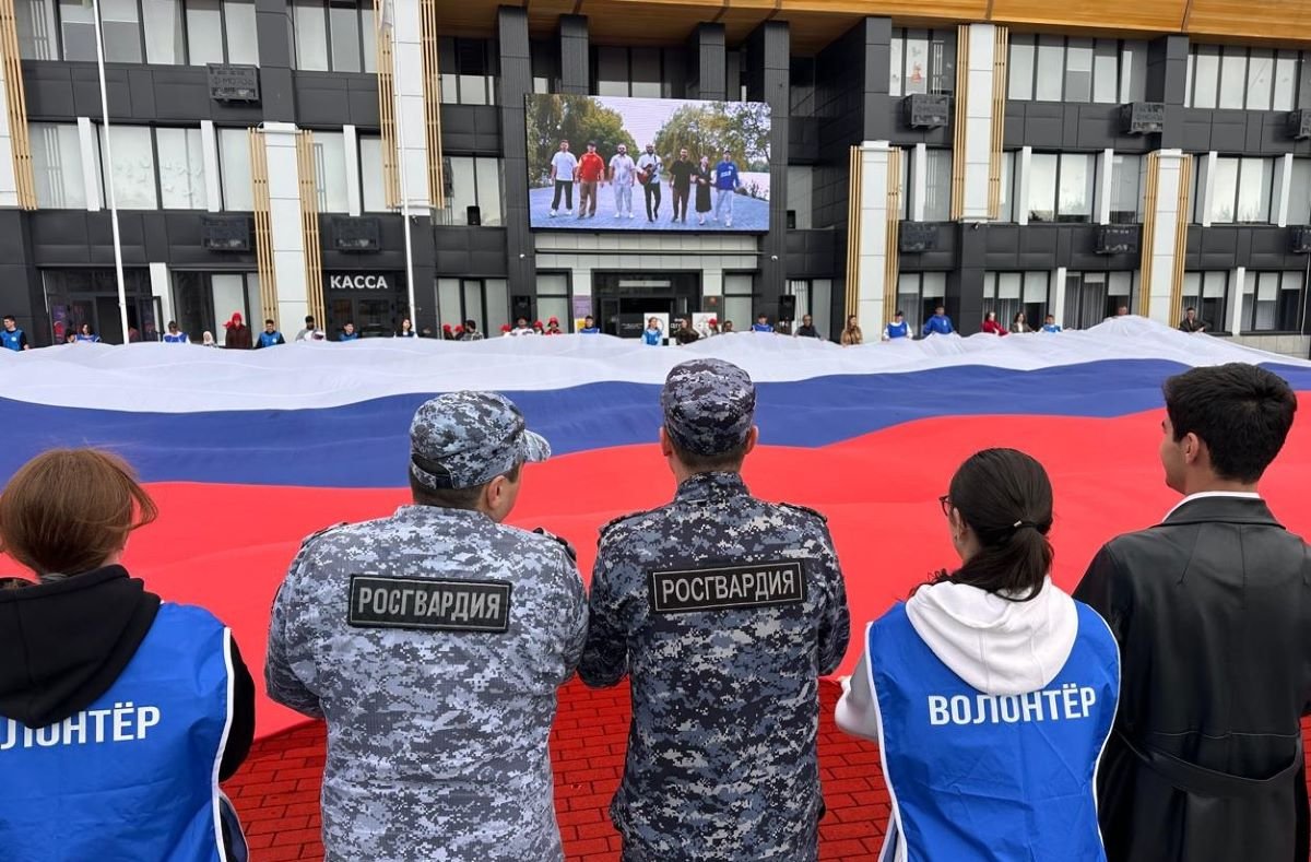 В завершение росгвардейцы поздравили жителей с праздником, вручили им флажки-триколоры, символизирующие единство многонационального народа России и совместно с коллегами из других силовых ведомств, молодежных организаций и жителей столицы тожественно развернули 30-метровый триколор.