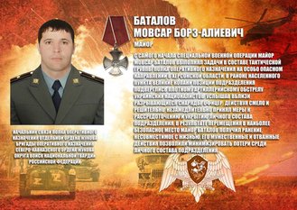Указом Президента Российской Федерации за мужество, отвагу и самоотверженность, проявленные при исполнении воинского долга, майор Баталов Мовсар Борз-Алиевич награжден орденом Мужества (посмертно).