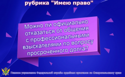 Как рассказали корреспонденту "Информационного агентства МАНГАЗЕЯ" в ГУФССП России по Ставропольскому краю, Федеральный закон от 03.07.2016 № 230-ФЗ «О защите прав и законных интересов физических лиц при осуществлении деятельности по возврату просроченной задолженности и о внесении изменений в Федеральный закон «О микрофинансовой деятельности и микрофинансовых организациях» вводит определенные требования к работе профессиональных взыскателей со своими клиентами. В случае нарушения обязательных требований предусмотрена административная ответственность по ст. 14.57 КоАП РФ.А можно ли официально отказаться от общения с профессиональными взыскателями по вопросу просроченного долга рассказал главный судебный пристав Ставрополья Абудл Алаудинов: