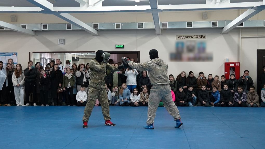 Мероприятие продолжилось в спортивном зале, где бойцы провели мастер-класс по рукопашному бою, а юные спортсмены продемонстрировали приёмы самообороны.