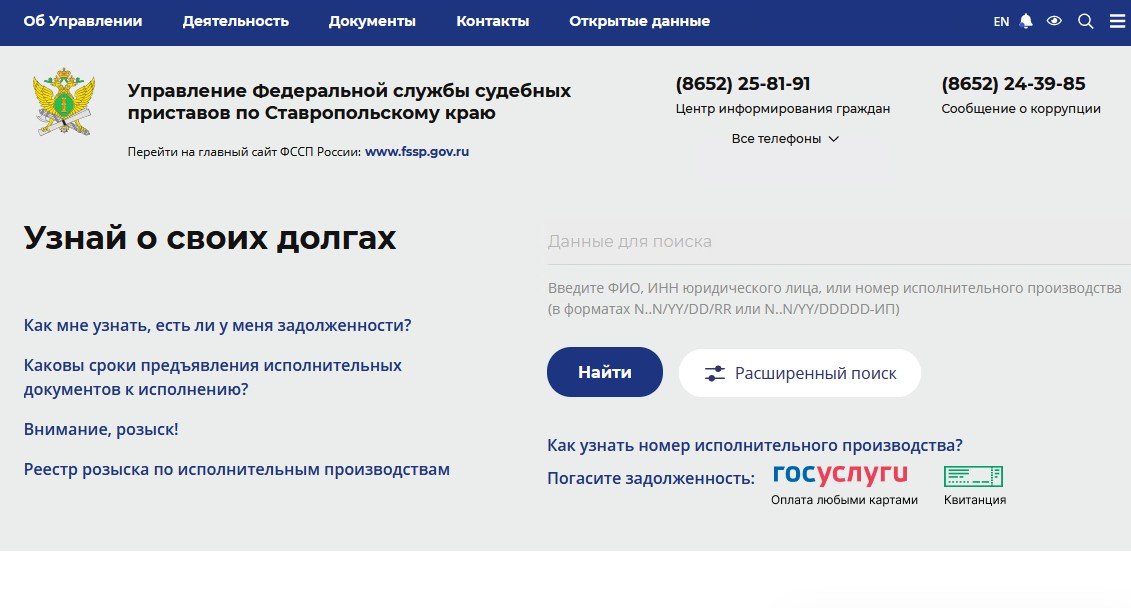 Где можно узнать информацию о своих долгах в службе судебных приставов рассказал корреспонденту "Информационного агентства МАНГАЗЕЯ" главный судебный пристав Ставропольского края Абдул Алаудинов:- На нашем официальном сайте есть бесплатный сервис «Банк данных исполнительных производств», который позволяет каждому желающему, как физическому, так и юридическому лицу, получить точную информацию о наличии задолженности. В нём указаны номер и дата исполнительного документа, наименование органа, выдавшего его, сумма долга, подразделение, в котором находится исполнительное производство, а также фамилия и телефон судебного пристава.