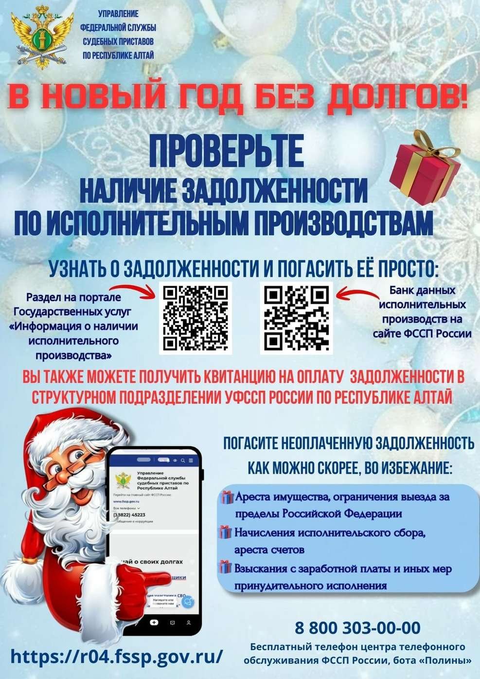 УФССП России по Республике Алтай призывает граждан не омрачать новогодние выходные и напоминает о важности погашения имеющихся задолженностей по исполнительным производствам, сообщили корреспонденту Информационного агентства МАНГАЗЕЯ в пресс-службе УФССП России по Республике Алтай.