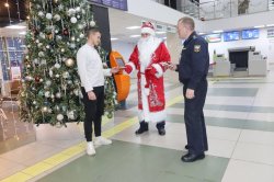 Мероприятие состоялось в здании аэропорта Горно-Алтайска и на городском автовокзале, где сотрудники ведомства работали с необычным сопровождением – вместе с Дедом Морозом.