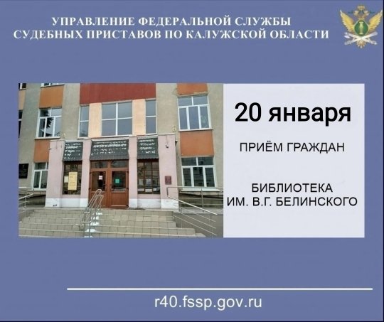 Во вторник, 20 января сотрудник УФССП России по Калужской области проведет приём граждан на базе библиотеки Белинского в Калуге.Как сообщили корреспонденту Информационного агентства МАНГАЗЕЯ, обратиться за правовой помощью к должностному лицу органа принудительного исполнения можно будет во вторник с 16 до 18 часов в Центре правового просвещения и правовой информации, который функционирует в Государственной областной научной библиотеки им. В.Г. Белинского.