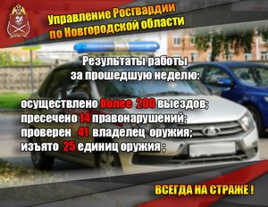Как сообщили корреспонденту информационного агентства "Мангазея" в пресс-службе Управления Росгвардии по Новгородской области, что за прошедшую неделю сотрудниками подразделений вневедомственной охраны Росгвардии по Новгородской области осуществили 261 выезд на охраняемые объекты по сигналу «тревога». По сообщениям из дежурных частей территориальных органов внутренних дел для обеспечения безопасности граждан и общественного порядка сотрудники вневедомственной охраны выезжали 41 раз. Кроме того, за вышеуказанный период сотрудниками вневедомственной охраны пресечено 1 административное правонарушение, составлено 14 административных протоколов.