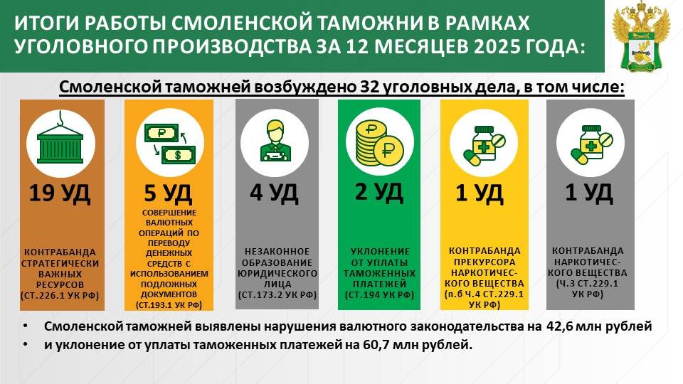 Смоленские таможенники в 2025 году зарегистрировали 78 сообщений о преступлениях. По результатам их рассмотрения таможня возбудила 32 уголовных дела (далее УД).