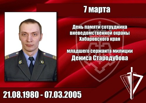 Ежегодно 7 марта сотрудники подразделений Росгвардии Хабаровского края отдают дань памяти и уважения своему товарищу по службе младшему сержанту милиции Денису Стародубову, погибшему при исполнении служебных обязанностей, сообщили корреспонденту Информационного агентства МАНГАЗЕЯ в пресс-службе Управления Росгвардии по Хабаровскому краю.
