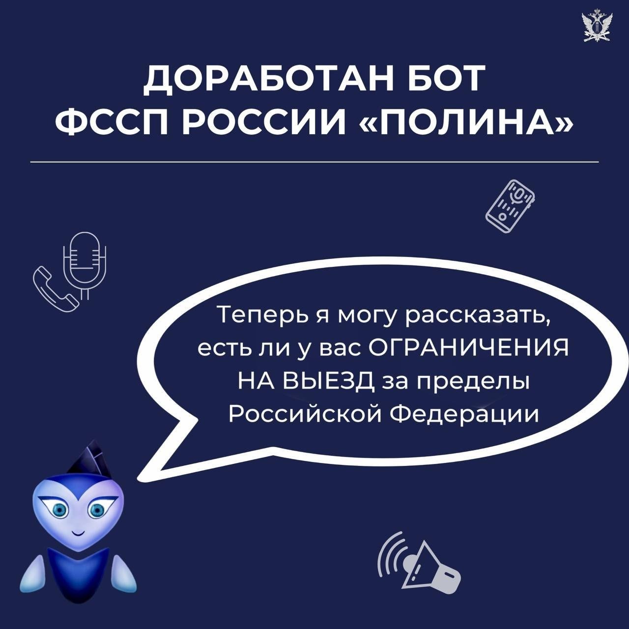 Калужские судебные приставы информируют, что функционал виртуального помощника ФССП России «Полины» усовершенствован. Через искусственный интеллект теперь можно узнать об ограничении на выезд из страны.Как сообщили корреспонденту Информационного агентства МАНГАЗЕЯ, в центре телефонного обслуживания Федеральной службы судебных приставов на бесплатном номере 8 (800) 303 0000 доступен виртуальный помощник – голосовой бот «Полина». Алгоритм общения с ассистентом прост: набрать указанный номер, задать вопрос, сообщить номер исполнительного производства, ответить на вопросы об идентификации личности. Далее виртуальный помощник ответит на ваш вопрос.