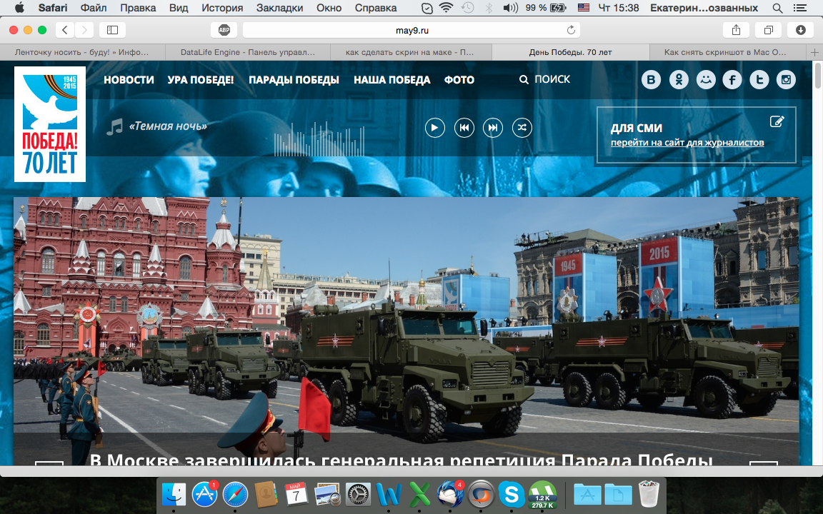 Сайт посвящён празднованию дня Победы. Можно посмотреть парады прошлых лет, проголосовать за «самую» военную песню, узнать расписание мероприятий праздника в этом году.