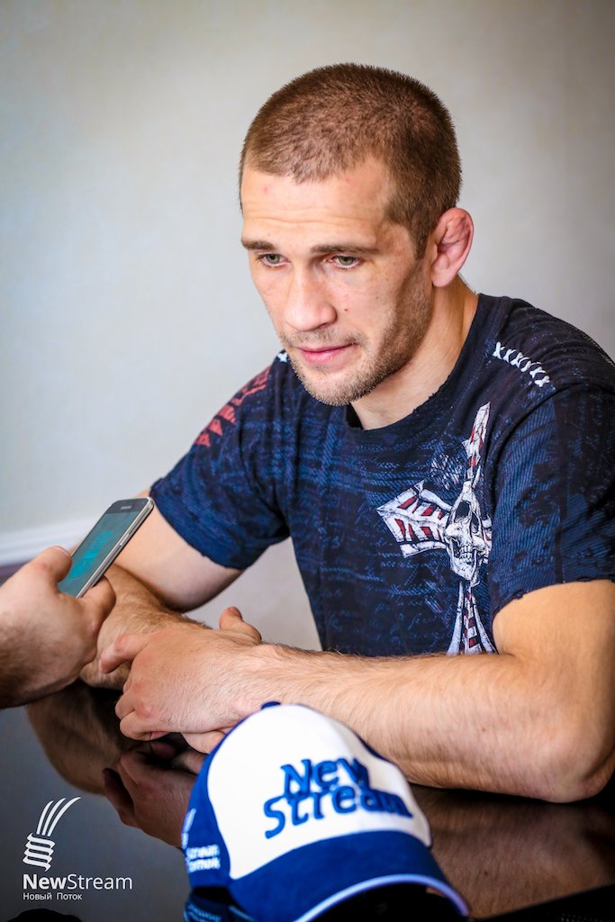 Я Александра знаю очень давно, мы с Андреем Корешковым тренируемся у него не один год. Ко всем боям готовимся только под его руководством. Он нас привёл в спорт, точнее не так, он показал нам, что можно достичь, если заниматься единоборствами. Мы стараемся не отставать от него. Александр заряжает нас своей энергией, стремлением, правильно мотивирует. Мы смотрим на него, и хотим стать такими же. Я никогда в своей жизни не хотел выступать в смешанных единоборствах. В 14 лет, когда еще маленький был, посмотрел бои, тогда они назывались «Панткратион», и сказал, что там выступать я никогда не буду, но в жизни никогда нельзя зарекаться. Все перевернулось в 18 лет, когда окончил школу, и нужны были деньги, а у родителей стыдно было просить, потому что я уже взрослый парень, должен быть самостоятельным. Александр мне тогда говорил, что бы верил в себя и все получится, но я до конца не был уверен. Ну, представьте: вы - молодой парень, вам 19 лет, и вы выходите против зрелого мужчины, который физически кажется крепче и сильнее (улыбается). Ну ничего, как-то нормально, втянулся, переборол этот испуг. И поверил в себя, благодаря Александру. Знаете, в каждом зале должен быть лидер. Александр - именно тот человек, на которого ровняются. Все ребята в нашей команде «Новый Поток» ровняются на него.