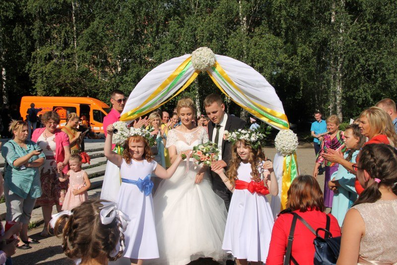В программе мероприятия также чествовали молодоженов. Молодые супруги Анна и Евгений прошли к сцене через живой коридор гостей свадьбы, жителей города и через Арку любви. Молодожены традиционно выпустили в небо белых голубей, предварительно загадав желание, и исполнили свадебный вальс.