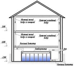 Согласно разработанной схеме на крыше здания установлен воздушный солнечный коллектор, который передает энергию на чердак к тепловому насосу. По специальным воздуховодам воздух из объема дома подается в теплоизолированное подвальное помещение, в котором летом он охлаждается, а зимой – нагревается тепловой энергией, накопленной за лето. Энергохранилище представляет собой пространство с емкостями, наполненными водой и специальными теплообменными устройствами, в том числе необычно сконструированными трубками с ребристой поверхностью.