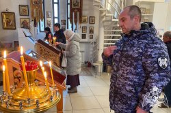 В областной столице росгвардейцы посетили Храм во имя святого благоверного князя Димитрия Донского. Офицеры вместе с прихожанами совершили молитву, приложились к святыням и поставили свечи во здравие всех защитников Отечества.