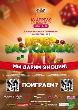 18 апреля в Ханты-Мансийске соберется клуб настольных игр "Чердак". Встреча состоится в кафе Югорского госунивесритета "Большая перемена" с 18:00 до 24:00.Гостей вечера ожидают два турнира: по Дженге и Добблю с призами от клуба и спонсоров. Внимание - новинка! Любители компьютерных технологий смогут увидеть программируемых роботов LEGO. Живое общение и заряд позитива организаторы гарантируют. Обещают и сюрприз. Ждем.