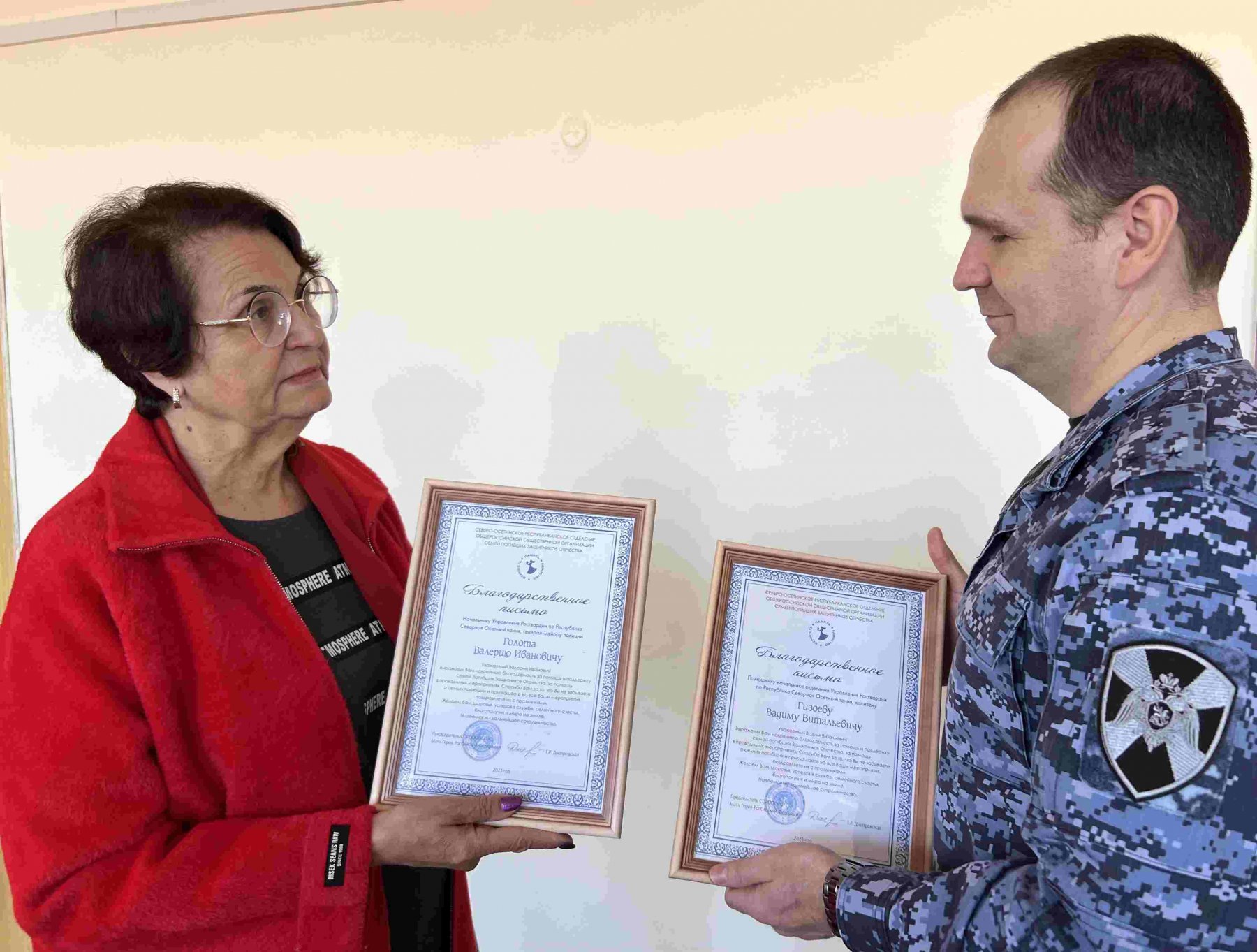 Как сообщили корреспонденту Информационного агентства МАНГАЗЕЯ, благодарность начальнику территориального Управления Росгвардии генерал-майору полиции Валерию Голота передала председатель Северо-Осетинского республиканского отделения Общероссийской общественной организации Семей погибших защитников Отечества, мать Героя Российской Федерации Татьяна Днепровская.