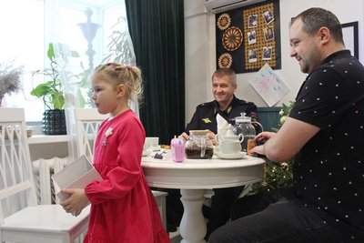 Во время чаепития начальник УМВД области пообщался с детьми, узнал об их увлечениях и ближайших планах на будущее. Дети рассказали несколько новогодних стихотворений. А потом Ева успела раскрасить фломастерами наиболее понравившуюся ей фотографию и заботливо убрала в альбом.