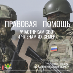 Справочно: В УФССП России по Калининградской области участники специальной военной операции и члены их семей могут получить консультацию и правовую поддержку в любой рабочий день с 09:00 до 18:00 (перерыв с 13.00 до 14.00). Адрес управления: г. Калининград, пр-кт Мира, 5-7. Если нет возможности прийти лично, можно позвонить по телефонным номерам: 8 (4012) 539-396, 924-922, 924-900.