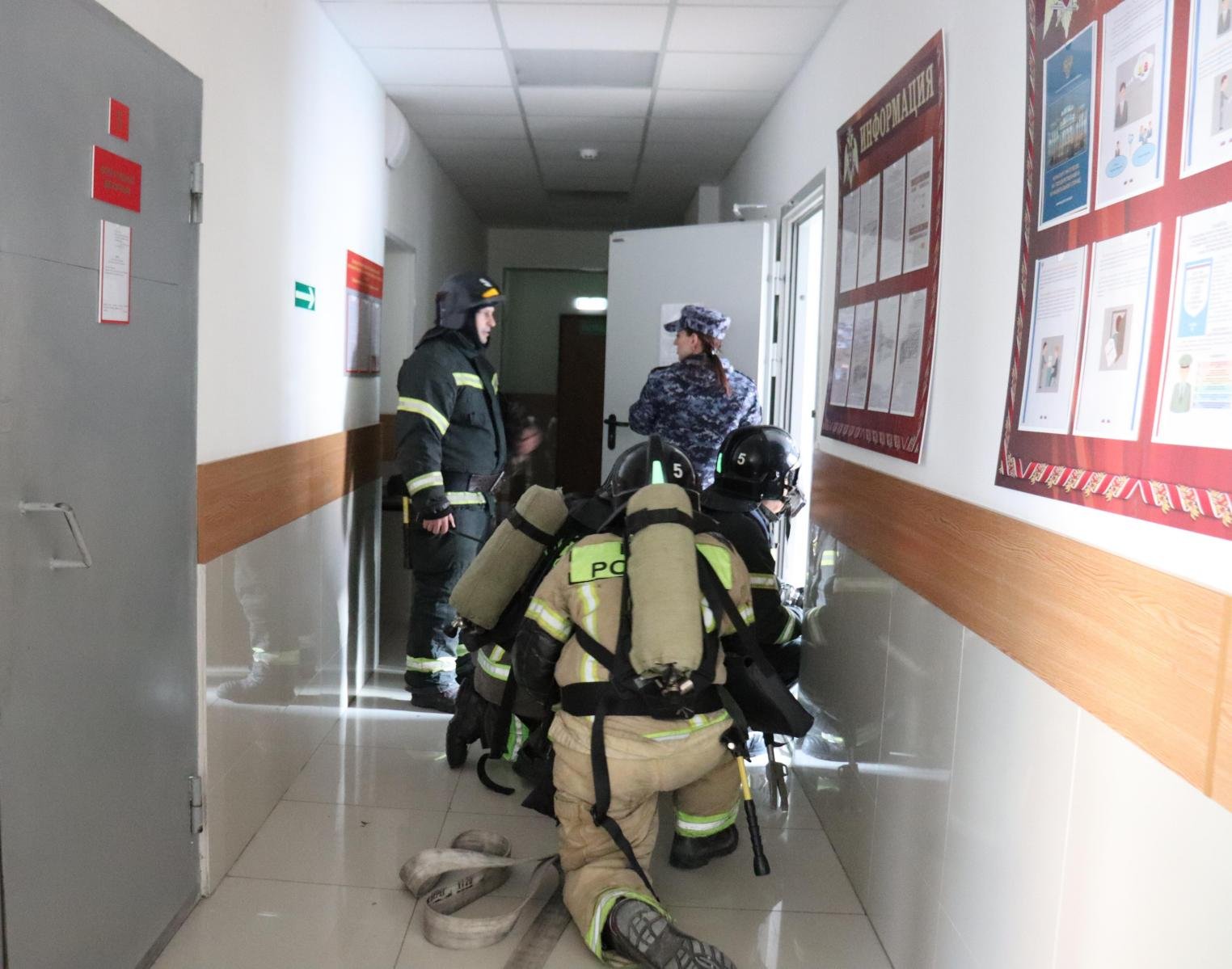 В ходе учений сотрудники ведомств отработали совместные действия по тушению условного пожара и эвакуации личного состава.