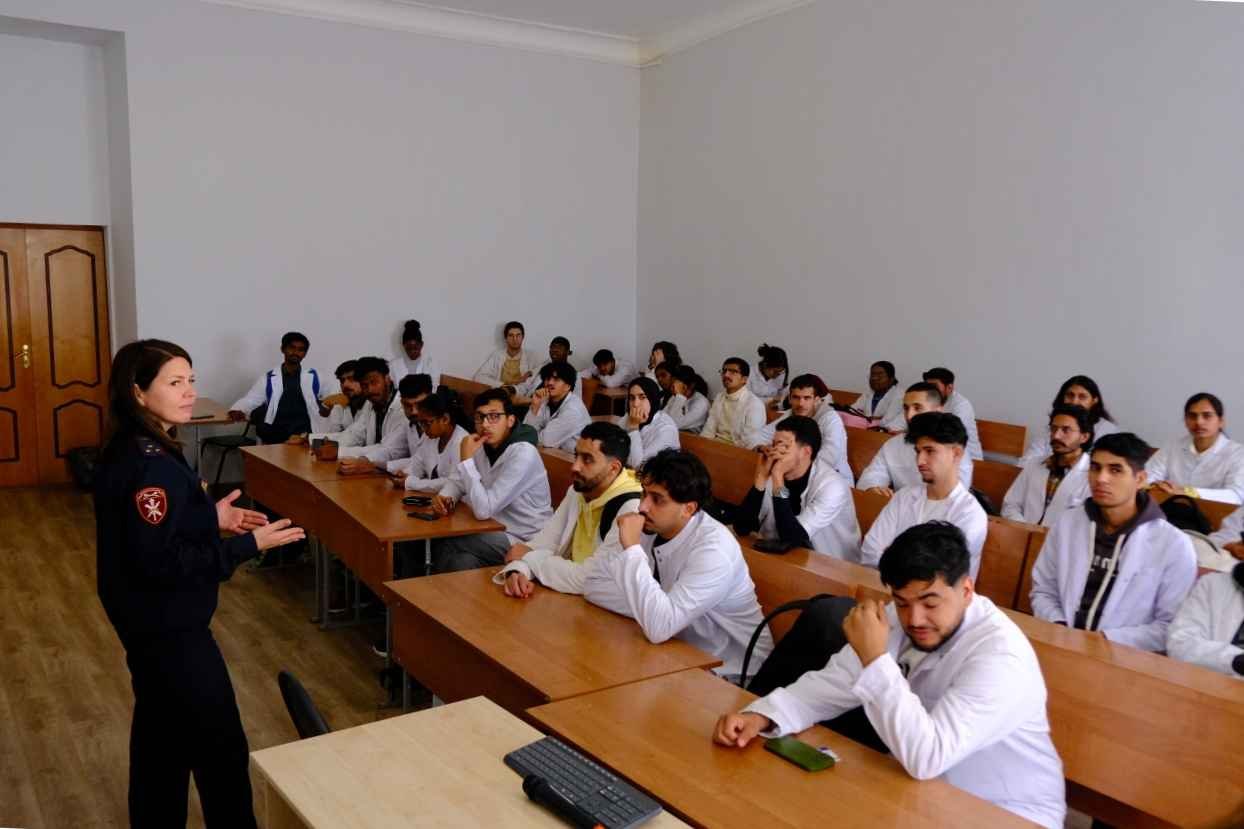 С помощью переводчика офицер тероргана старший лейтенант Юлия Колесникова рассказала будущим медикам об основных задачах, возложенных на войска национальной гвардии, важных датах и событиях. Особое внимание было уделено примерам мужества и героизма военнослужащих и сотрудников Росгвардии.