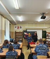 На Чукотке сотрудник Росгвардии провел урок пожарной безопасности в кадетском классе