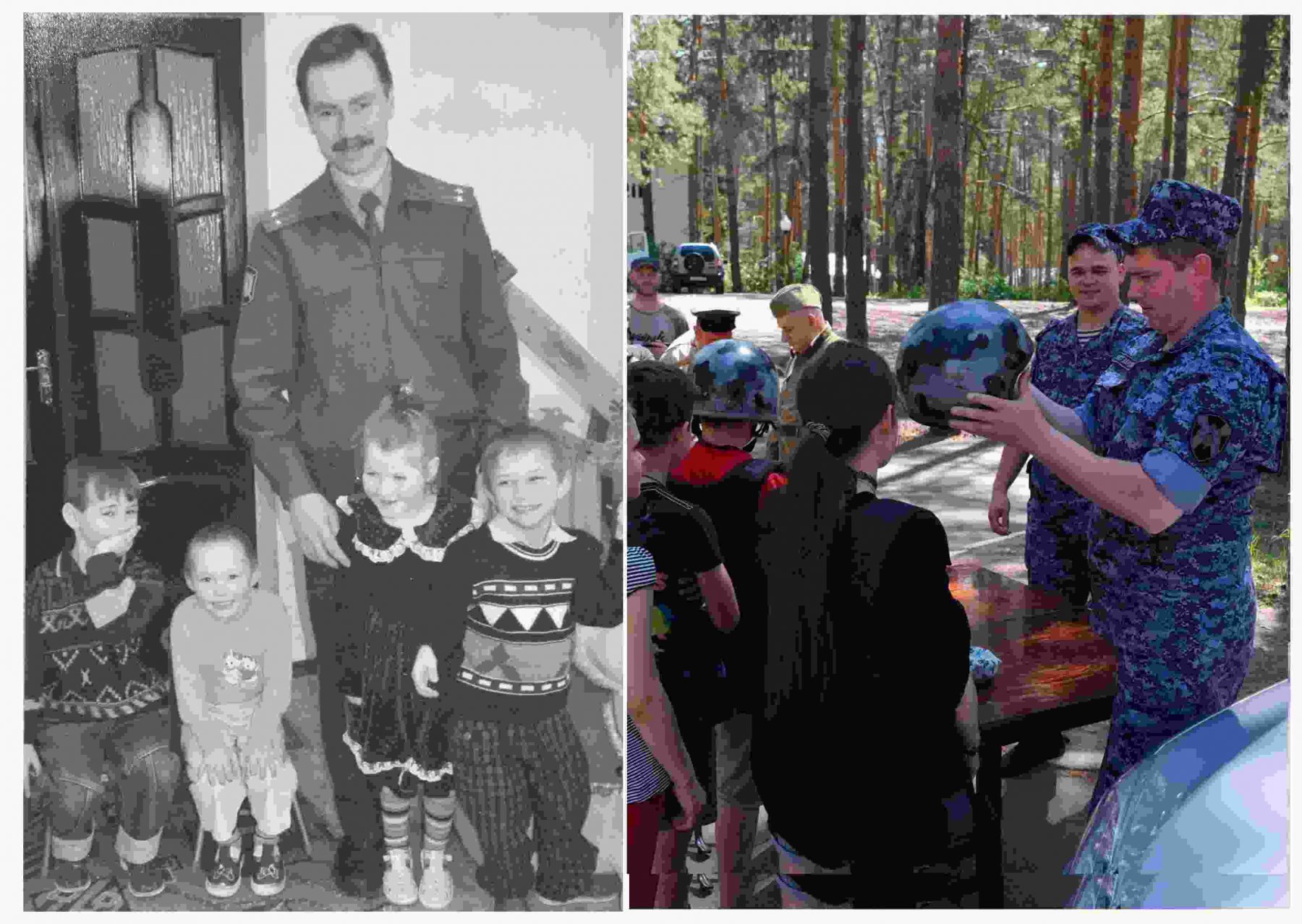 Среди множества работ особое место заняли кадры, разделенные десятилетиями, где запечатлены одни и те же люди — на архивных фото еще молодые бойцы, а сегодня ветераны и действующие сотрудники, продолжающие нести службу.