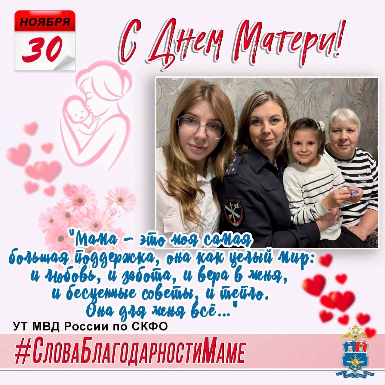 Как сообщили корреспонденту Информационного агентства МАНГАЗЕЯ, референт отделения информации и общественных связей УТ МВД России по СКФО капитан внутренней службы Вера Середа, вместе со своими дочками, Дарьей и Александрой, от всей души поздравляют маму и бабушку, Анну Николаевну, с Днём матери! Девочки выражают самую искреннюю благодарность за подаренную жизнь, за безграничную любовь, за мудрые советы и за ту непоколебимую поддержку, которая всегда помогает преодолевать любые трудности.