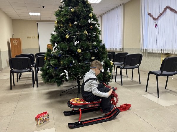 Давида и его родителей сотрудники полиции пригласили в гости в отдел, где рядом с красиво украшенной новогодней елью Давида ждал подарок – ярко-красный снегокат.