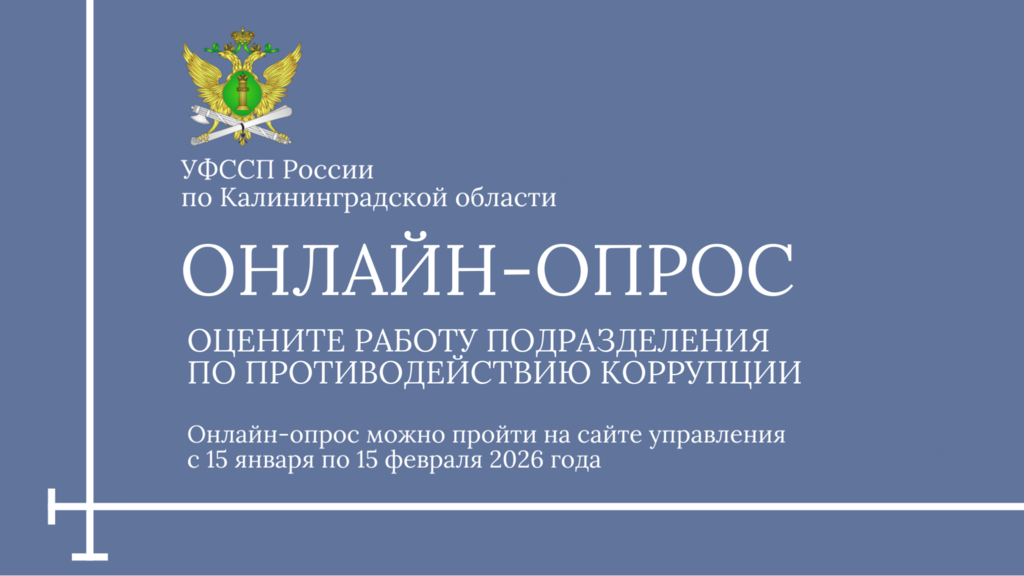В период с 15 января по 15 февраля 2026 года каждый желающий может зайти на сайт УФССП России по Калининградской области в раздел «Противодействие коррупции» и ответить на предложенные вопросы.