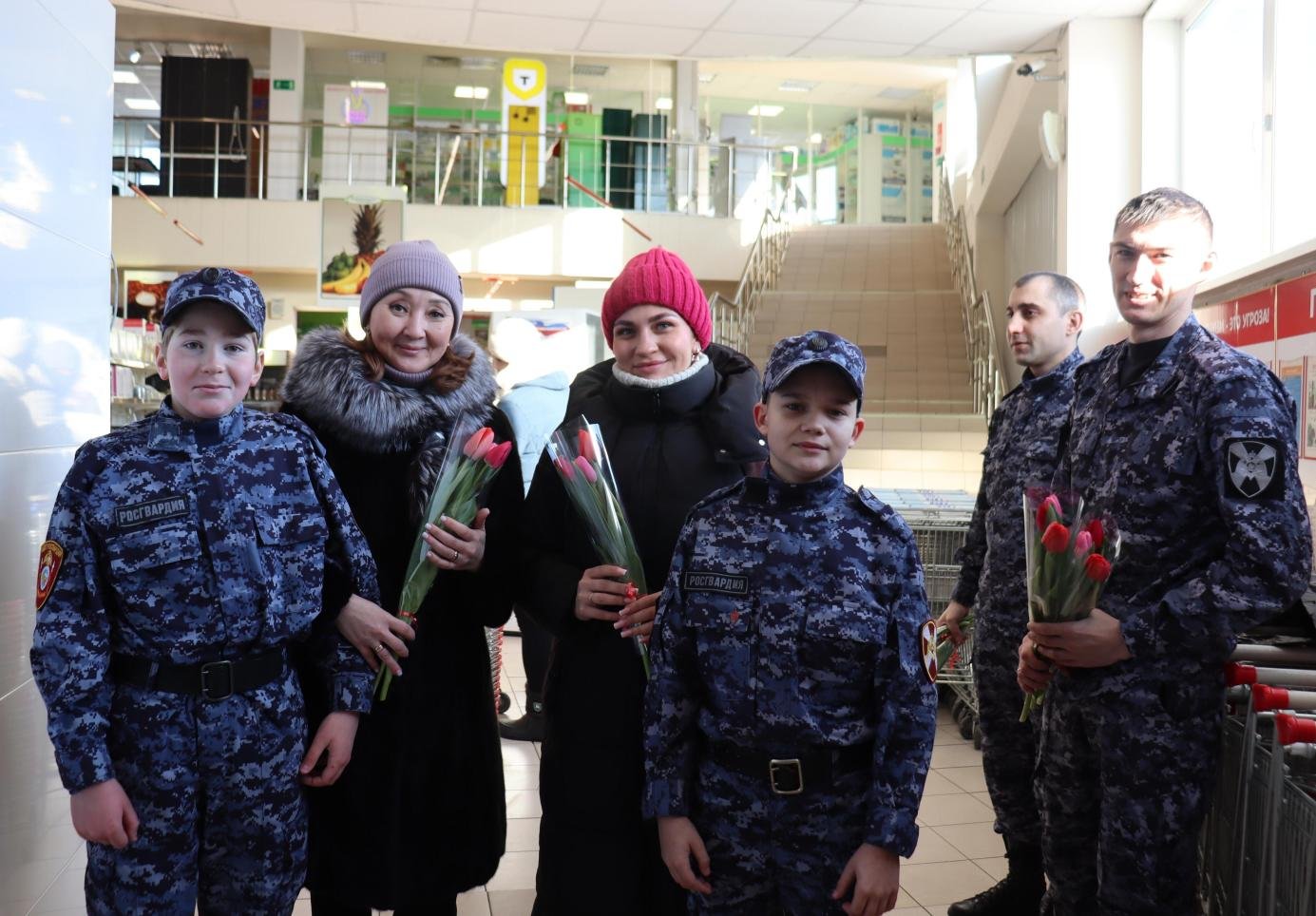 В этот день, росгвардейцы и их юные помощники - кадеты, облаченные в красивую форму, превратили обычный день в настоящий праздник. С самого утра они встречали посетительниц торгового центра, даря им не только яркие тюльпаны, но и самые искренние поздравления. Теплые слова, пожелания счастья, здоровья и весеннего настроения звучали от каждого участника акции, создавая атмосферу всеобщей радости и доброжелательности.