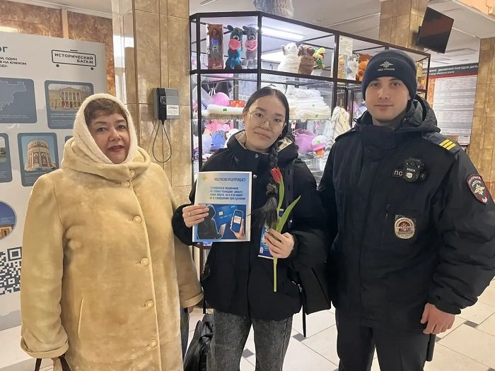 Но на этом праздничные мероприятия не закончились. Сотрудники патрульно-постовой службы совместно с представителем Общественного совета при ЛО Лидией Носенко на железнодорожном вокзале города дарили женщинам цветы и поздравляли с наступающим праздником. Помимо теплых пожеланий оставаться такими же прекрасными и неповторимыми, полицейские напомнили дамам о безопасности в сети Интернет и вручили памятки по профилактике дистанционного мошенничества.